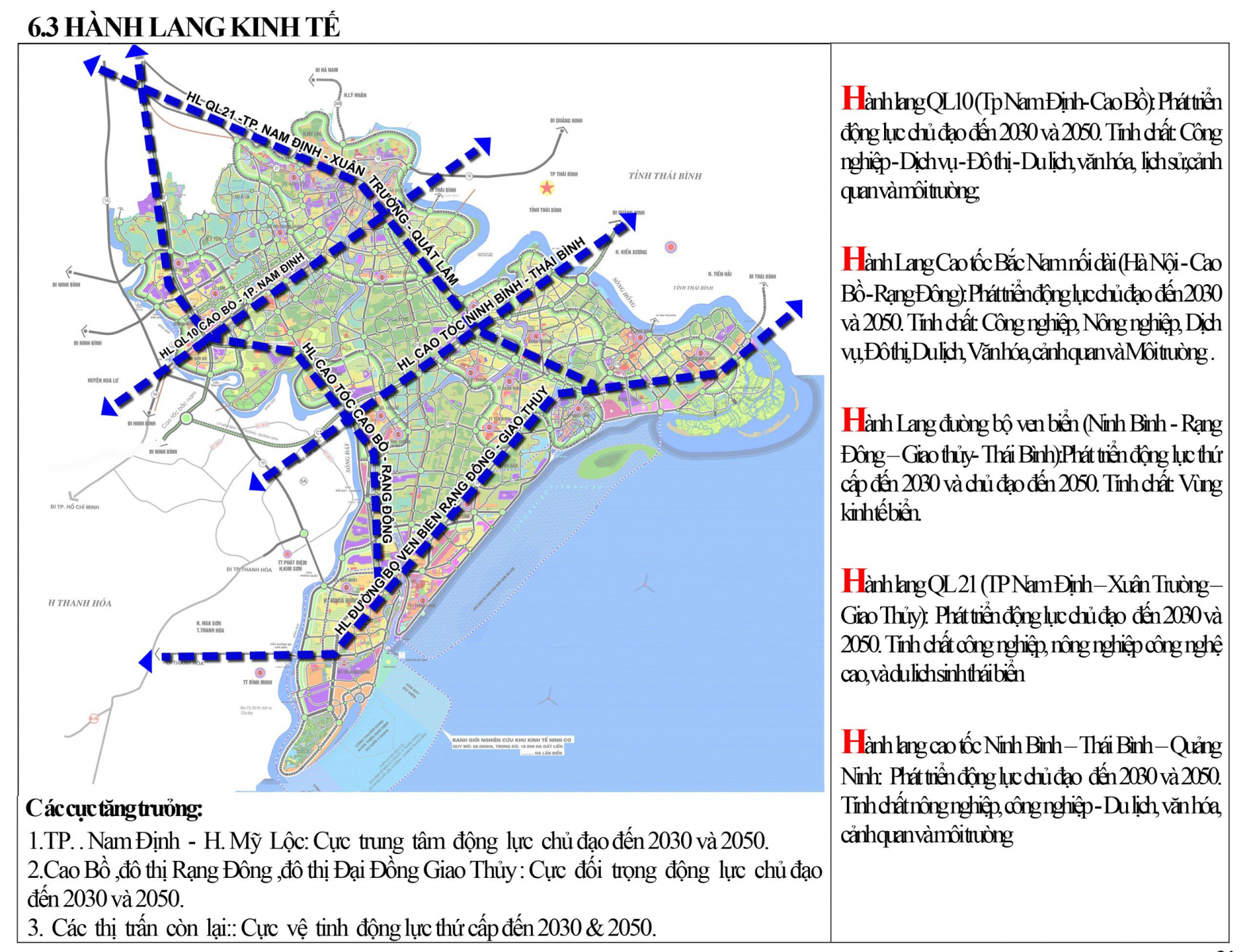 5 hành lang kinh tế động lực chủ đạo sẽ hình thành, phát triển gồm: Hành lang QL 10 (thành phố Nam Định - Cao Bồ), hành lang cao tốc Bắc - Nam nối dài (Hà Nội - Cao Bồ - Rạng Đông), hành lang tuyến đường bộ ven biển (Ninh Bình - Rạng Đông - Giao Thủy - Thái Bình), hành lang thành phố Nam Định - Lạc Quần - Giao Thủy, hành lang cao tốc Ninh Bình - Thái Bình - Quảng Ninh. Đây là những đột phá chính, trên cơ sở 4 cực tăng trưởng, 5 hành lang kinh tế sẽ mở ra không gian mới, tạo điều kiện cho tỉnh Nam Định phát triển bứt phá trong thời gian tới, đặc biệt là giai đoạn 2025-2030.