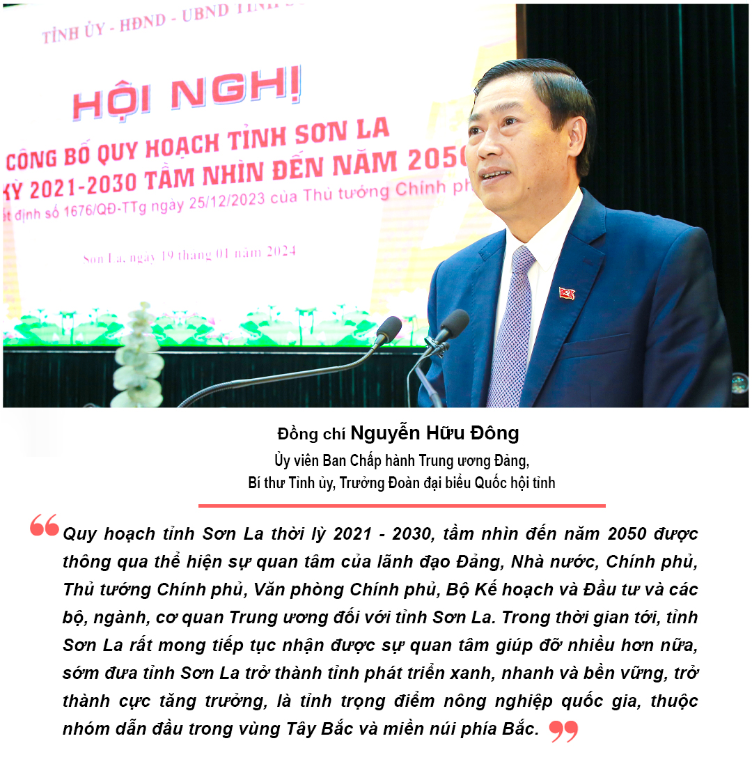 Với tầm nhìn, tư duy đổi mới, sáng tạo cùng khát vọng vươn lên phát triển, Quy hoạch tỉnh Sơn La thời kỳ 2021 - 2030, tầm nhìn đến năm 2050 được phê duyệt có vai trò quan trọng trong sự phát triển kinh tế - xã hội - môi trường - quốc phòng, an ninh. Đồng thời, là sản phẩm của sự kết tinh trí tuệ, tâm huyết của toàn Đảng bộ và nhân dân trong tỉnh, quyết tâm sớm đưa Sơn La trở thành tỉnh trọng điểm nông nghiệp quốc gia, thuộc nhóm dẫn đầu vùng Tây Bắc và miền núi phía Bắc.