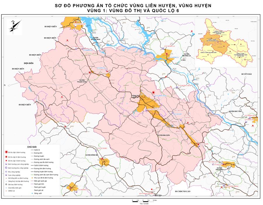 1.Phương án phát triển vùng liên huyện. Dựa trên nền tảng các liên kết nội vùng, lẫn ngoại vùng, kết hợp giữa tiếp cận kinh tế xã hội, tiếp cận không gian lãnh thổ hướng tới sự phát triển cân bằng và đồng chất giữa các huyện, thành phố. Tỉnh Sơn La quy hoạch xây dựng 4 vùng liên huyện gồm: Vùng Đô thị và Quốc lộ 6 (thành phố Sơn La và phụ cận); vùng Cao nguyên Mộc Châu và phụ cận (Mộc Châu, Vân Hồ, Yên Châu); vùng lòng hồ và lưu vực sông Đà (Quỳnh Nhai, Mường La, Bắc Yên, Phù Yên); Vùng Cao Biên Giới (Sông Mã, Sốp Cộp).