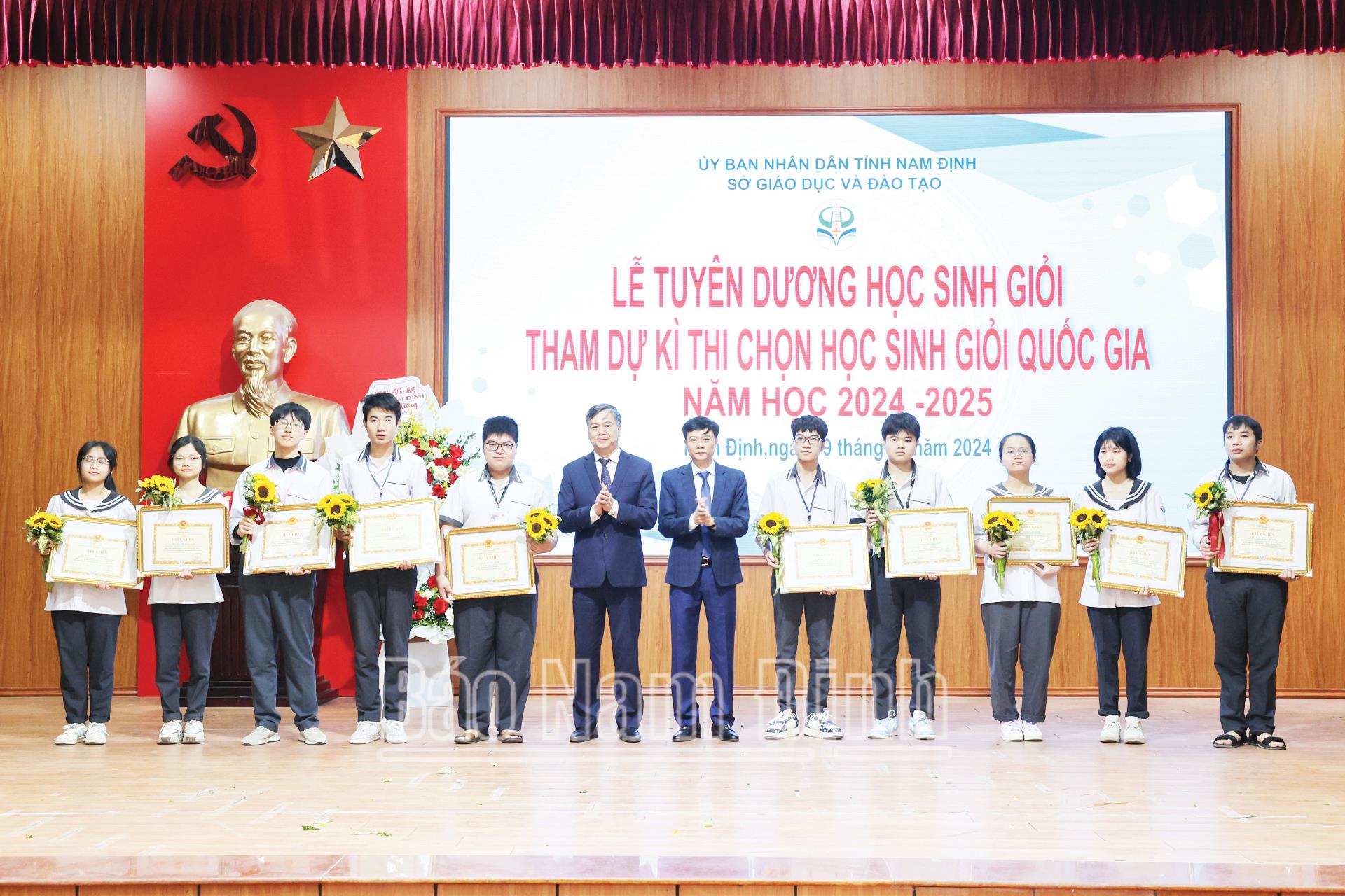 | Đồng chí Trần Lê Đoài, TUV, Phó Chủ tịch UBND tỉnh và lãnh đạo Sở Giáo dục và Đào tạo tuyên dương các học sinh tham dự Kỳ thi chọn học sinh giỏi quốc gia năm học 2024-2025. (Ảnh: Viết Dư) |