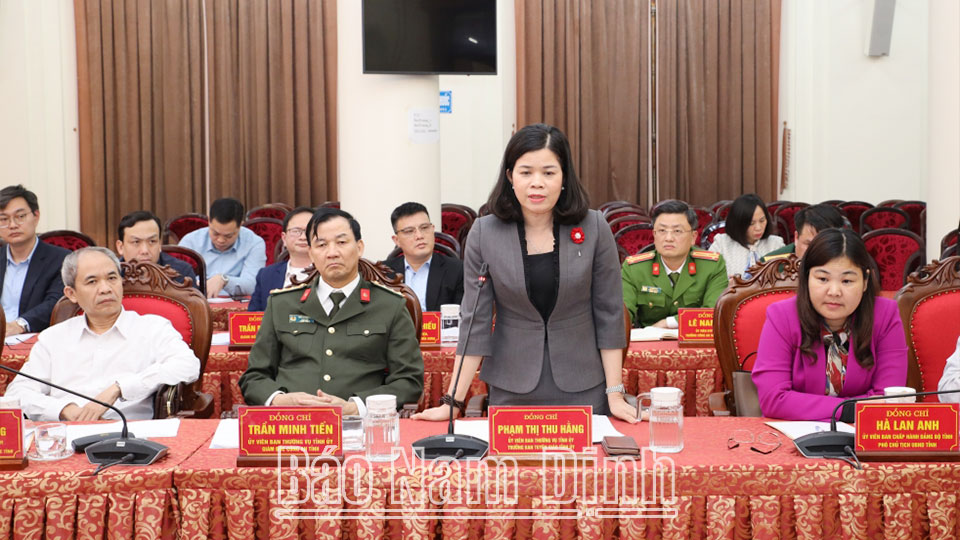 | Đồng chí Phạm Thị Thu Hằng, Ủy viên Ban TVTU, Trưởng ban Tuyên giáo Tỉnh ủy phát biểu tại hội nghị. |