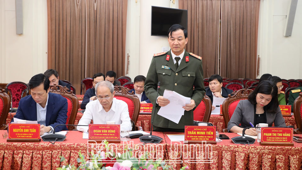 | Đại tá Trần Minh Tiến, Ủy viên Ban TVTU, Giám đốc Công an tỉnh phát biểu tại hội nghị. |
