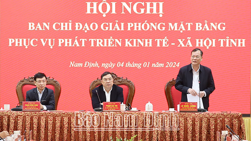 | Đồng chí Lê Quốc Chỉnh, Phó Bí thư Thường trực Tỉnh uỷ, Chủ tịch HĐND tỉnh, Trưởng đoàn Đoàn đại biểu Quốc hội tỉnh, Phó Trưởng Ban chỉ đạo GPMB phục vụ phát triển kinh tế - xã hội tỉnh phát biểu tại hội nghị. |