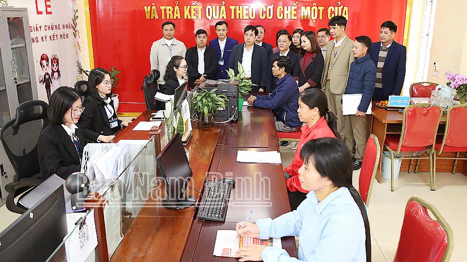 | Các đại biểu tham quan Bộ phận tiếp nhận và trả kết quả theo cơ chế một cửa xã Yên Thắng. |