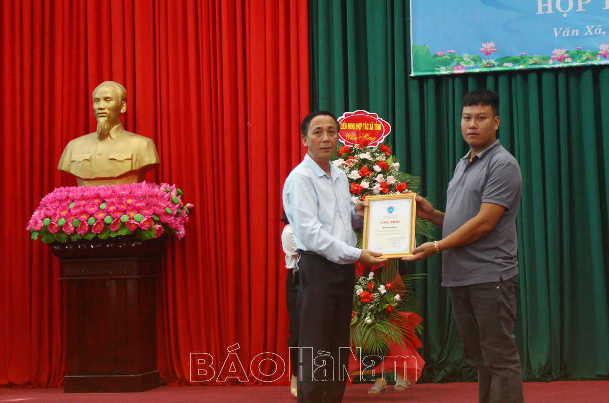 Đại diện Liên minh HTX tỉnh trao giấy chứng nhận thành viên Liên minh HTX tỉnh cho HTX Khải An
