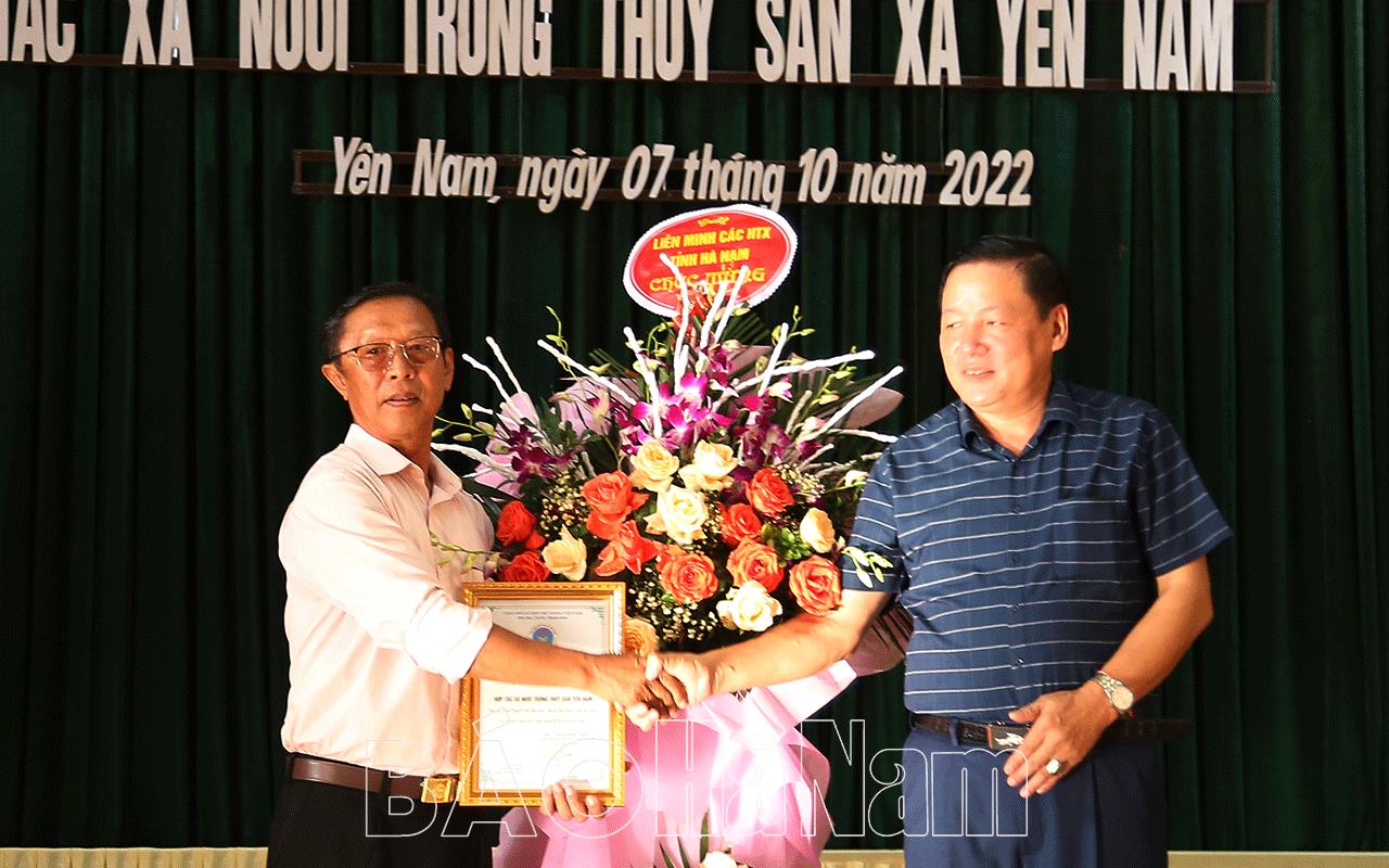 Lãnh đạo Liên minh HTX tỉnh trao giấy chứng nhận thành viên và tặng hoa chúc mừng HTX nuôi trồng thủy sản Yên Nam.