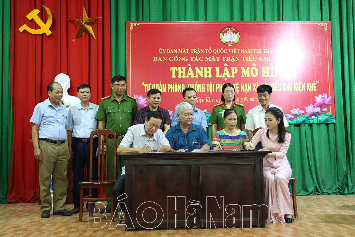 Lãnh đạo UBND, Ủy ban MTTQ thị trấn Kiện Khê và lãnh đạo Tiểu khu Kiện Khê ký cam kết thực hiện mô hình.Lãnh đạo Ban Công tác Mặt trận Tiểu khu Kiện Khê và các chi hội đoàn thể ký cam kết thực hiện mô hình.