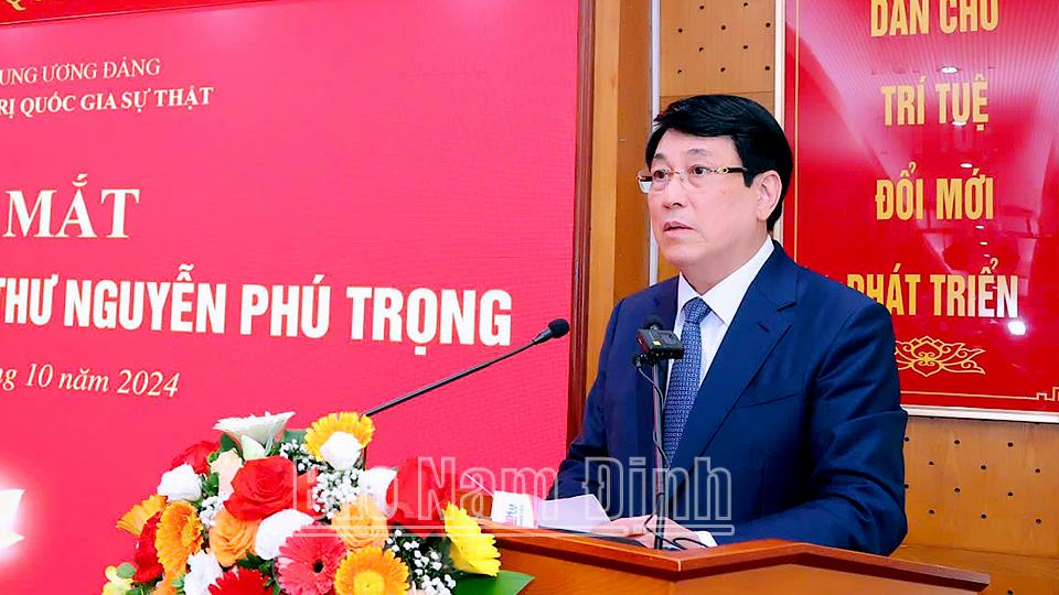 Phát biểu tại buổi lễ, Thường trực Ban Bí thư Lương Cường nêu rõ, các cuốn sách của cố Tổng Bí thư Nguyễn Phú Trọng bàn về những vấn đề lý luận rất rộng, nhưng cách trình bày lại rất dung dị, chắt lọc, tổng kết thực tiễn và lấy đời sống thực tiễn để chứng minh, thuyết phục. Sức hấp dẫn của các tác phẩm đó còn bởi tư duy, trí tuệ, phong cách, con người của đồng chí cố Tổng Bí thư và từ sự yêu mến, kính trọng, tin tưởng của nhân dân dành cho cố Tổng Bí thư Nguyễn Phú Trọng.
