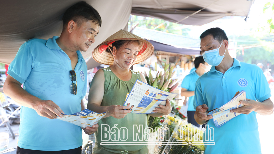 | Cán bộ Bảo hiểm xã hội tỉnh tư vấn cho người dân về chính sách bảo hiểm y tế tại chợ Hạ Long (thành phố Nam Định). |