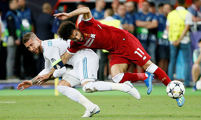Pha phạm lỗi của Ramos (trái) với Salah ở chung kết năm 2018 vẫn khiến CĐV Liverpool chưa nguôi ngoai.