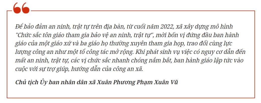 Ðể bảo đảm an ninh, trật tự trên địa bàn, từ cuối năm 2022, xã xây dựng mô hình "Chức sắc tôn giáo tham gia bảo vệ an ninh, trật tự", mời bốn vị đứng đầu ban hành giáo của một giáo xứ và ba giáo họ thường xuyên tham gia họp, trao đổi cùng lực lượng công an như một tổ công tác mở rộng. Khi phát sinh vụ việc có nguy cơ dẫn đến mất an ninh, trật tự, các vị chức sắc nhanh chóng nắm bắt, ban hành giáo lập tức vào cuộc với sự trợ giúp, hướng dẫn của công an xã. Sau một năm thực hiện, mô hình này đã phát huy hiệu quả rất tốt, số vụ vi phạm pháp luật, phạm pháp hình sự tại địa phương được kéo giảm rõ rệt so với năm 2022.