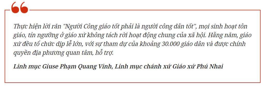 Linh mục Giuse Phạm Quang Vinh, Linh mục chánh xứ Giáo xứ Phú Nhai cho biết, thực hiện lời răn "Người Công giáo tốt phải là người công dân tốt", mọi sinh hoạt tôn giáo, tín ngưỡng ở giáo xứ không tách rời hoạt động chung của xã hội. Hằng năm, giáo xứ đều tổ chức dịp lễ lớn, với sự tham dự của khoảng 30.000 giáo dân và được chính quyền địa phương quan tâm, hỗ trợ. Linh mục luôn răn dạy giáo dân hướng đến sự lương thiện, bác ái, nỗ lực làm tốt bổn phận của mình và góp sức vào các phong trào xây dựng, phát triển quê hương.