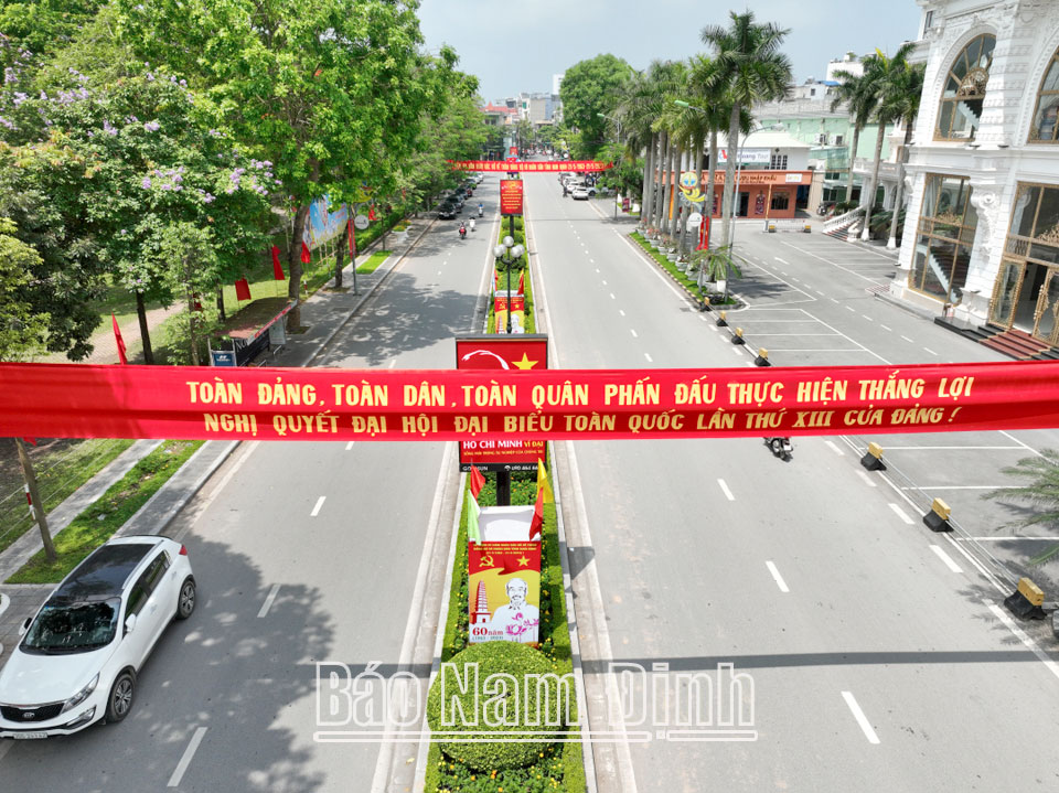Thành phố Nam Định là trung tâm chính trị, kinh tế, văn hóa - xã hội của tỉnh nên hoạt động trang trí đường phố được UBND thành phố chỉ đạo triển khai, tạo các điểm nhấn cảnh quan khu vực trung tâm, các cửa ngõ và các tuyến đường, phố. Các đảo giao thông lớn đều được trang trí các loại hoa rực rỡ sắc màu. Dọc các tuyến phố chính, hệ thống đèn chiếu sáng, biểu ngữ, đèn LED điện tử kết hoa khiến thành phố Nam Định càng trở nên rực rỡ hơn. Tại khu vực tượng đài Quốc công Tiết chế Hưng Đạo Đại Vương Trần Quốc Tuấn, Công ty CP công trình đô thị Nam Định bố trí các chậu hoa đặt tại hai bên tượng đài tạo điểm nhấn. Tuyến đường Nguyễn Du trang trí băng rôn, pa-nô và hàng chục chậu hoa rủ ôm thân cột đèn chùm, trên dải phân cách giữa đường được trang trí bằng thảm hoa tươi. Các tuyến đường Vỵ Hoàng, Võ Nguyên Giáp đều được trang trí, duy trì hoa tươi tại bồn hoa hè đường, thảm hoa dải phân cách giữa đường. Ngoài ra, trên các tuyến đường Võ Nguyên Giáp, Đại lộ Thiên Trường, Công ty bố trí 214 bộ giá cờ treo thân cột điện chiếu sáng.