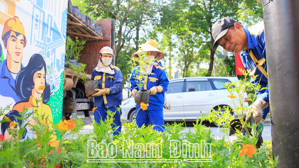 | Công nhân Công ty Cổ phần Công trình đô thị Nam Định trang trí hoa tươi khu vực công viên Vị Xuyên (thành phố Nam Định). |