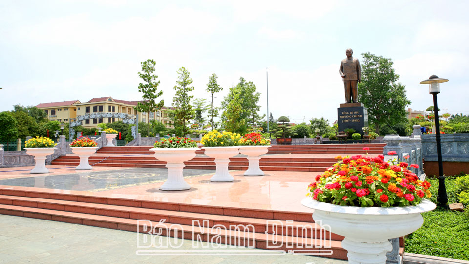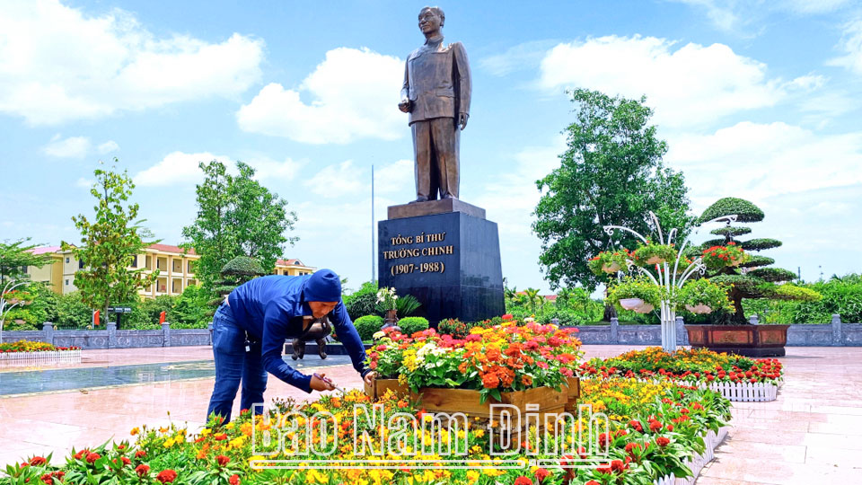 | Khu vực Tượng đài Tổng Bí thư Trường Chinh tại trung tâm huyện Xuân Trường được trang trí các chậu hoa tươi. |