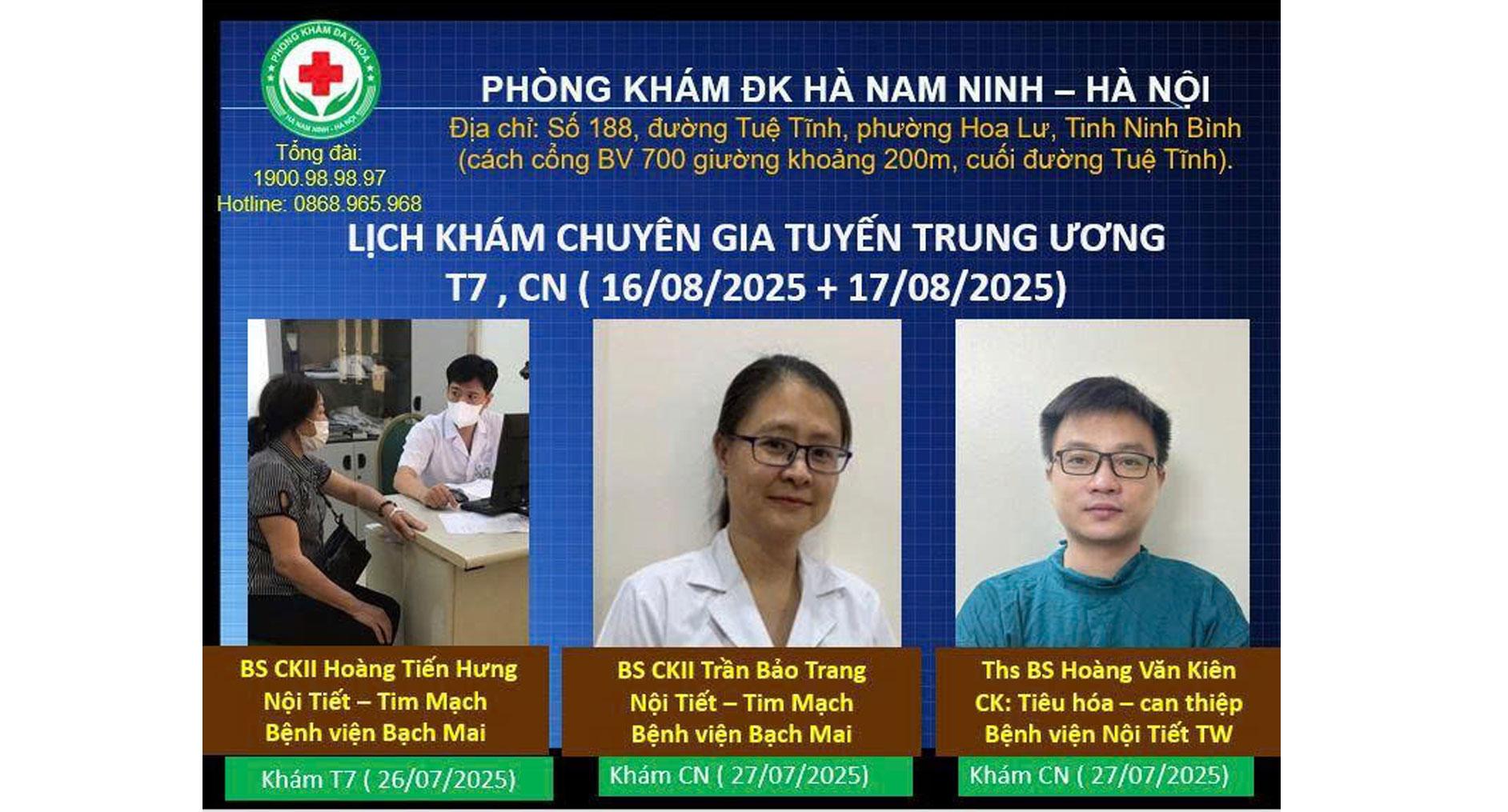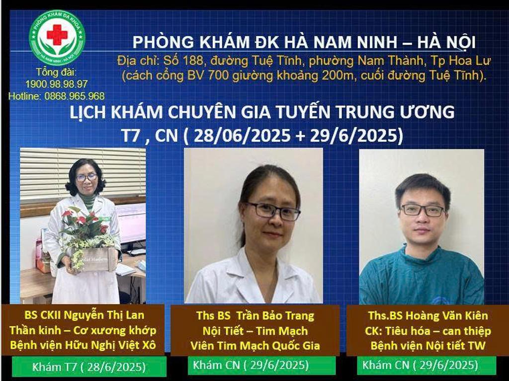 Bạn muốn khám bệnh cùng chuyên gia tuyến Trung ương nhưng ngại đi xa, ngại chờ đợi lâu, lại không được hưởng bảo hiểm. Hãy đến với Phòng khám đa khoa Hà Nam Ninh - Hà Nội cuối tuần này thứ 7 và Chủ nhật ngày ( 18/10/2025 và 19/10/2025). Chúng tôi sẽ mang đến dịch vụ khám chuyên sâu với các bác sĩ bệnh viện tuyến Trung ương.