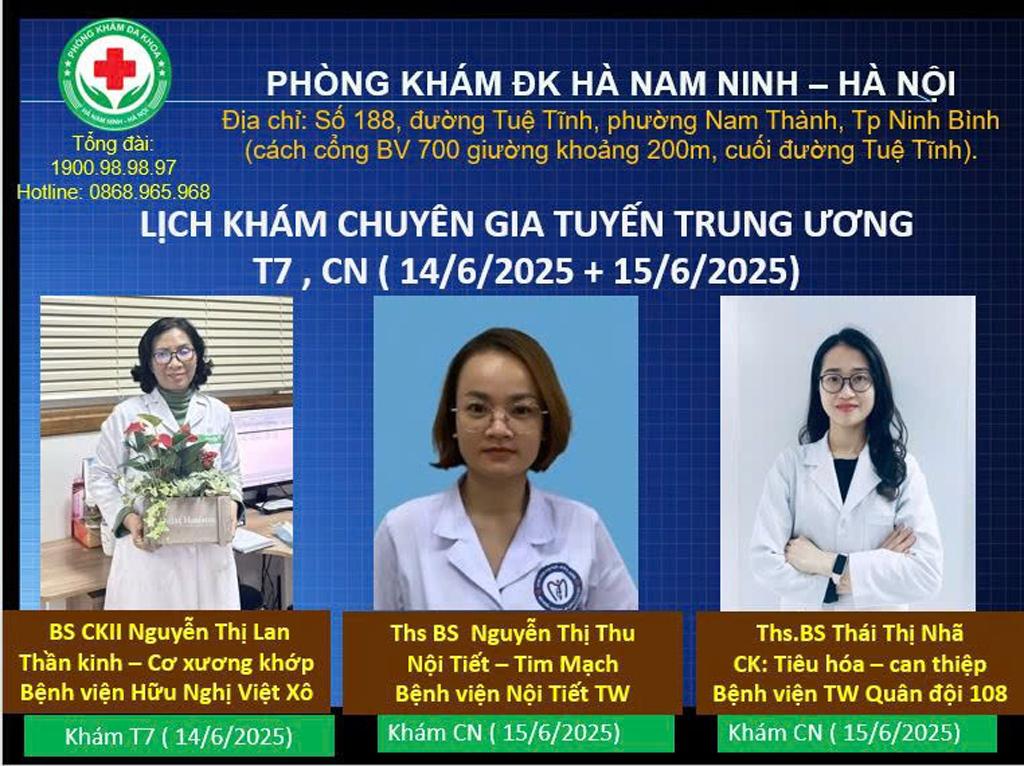 Bạn có nhu cầu khám sức khỏe tại thành phố Hoa Lư với các bác sĩ chuyên gia làm việc ở những bệnh viện hàng đầu tuyến Trung ương về các bệnh lý: Nội tổng hợp, Cơ xương khớp, thần kinh, Tim mạch, Tiêu hóa, Tầm soát ung thư sớm. Hãy đăng ký ngay với Phòng khám Đa khoa Hà Nam Ninh - Hà Nội thứ 7 và chủ nhật tuần này (28/6/2025 29/6/2025).