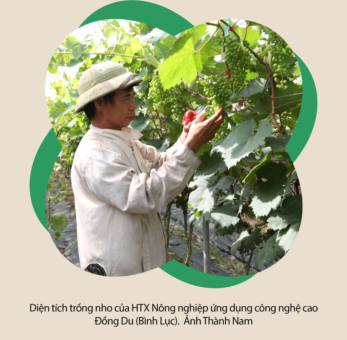 Hợp tác xã (HTX) nông nghiệp ứng dụng công nghệ cao Đồng Du (Bình Lục) là một minh chứng rõ nét trong việc áp dụng khoa học – kỹ thuật vào nhiều khâu sản xuất. Hiện, HTX có hơn 2 ha trồng nho hạ đen và nho mẫu đơn được trồng trong nhà màn với hệ thống tưới nước tiết kiệm có hẹn giờ, điều khiển kết nối bằng điện thoại thông minh. Khi bước vào thời điểm chuẩn bị thu hoạch, HTX sử dụng máy đo các chỉ số, nhất là tỷ lệ đường đảm bảo nho đạt tiêu chuẩn tốt nhất khi đưa ra thị trường. Sản phẩm khi đưa ra thị trường được dán tem nhãn truy xuất nguồn gốc… Nhờ đó, mô hình trồng nho áp dụng công nghệ của HTX đem lại hiệu quả cao. Chất lượng của sản phẩm nho hạ đen và nho mẫu đơn đủ sức cạnh tranh với những sản phẩm cùng loại trên thị trường và được người tiêu dùng đón nhận. Anh Phạm Văn Đức, Giám đốc HTX Nông nghiệp ứng dụng công nghệ cao Đồng Du cho biết: Việc áp dụng công nghệ số đã đem lại rất nhiều tiện ích trong quá trình sản xuất, tiêu thụ sản phẩm của HTX. Thời gian tới, HTX sẽ tiếp tục đầu tư đưa công nghệ số vào các khâu sản xuất, kiểm soát chất lượng sản phẩm… hướng tới những thị trường lớn trong nước và khu vực.