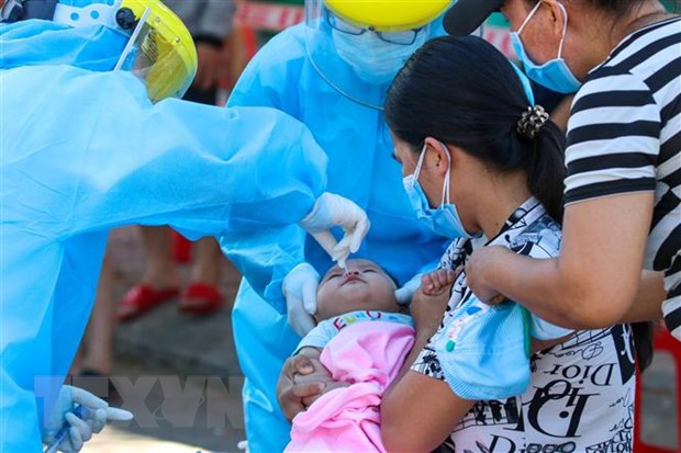 Các bé sơ sinh cũng đều phải thực hiện lấy mẫu xét nghiệm. (Ảnh: Trần Lê Lâm/TTXVN)