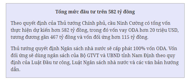 Điểm đầu của dự án thuộc địa phận xã Trực Phú, huyện Trực Ninh và điểm cuối thuộc địa phận thị trấn Liễu Đề, huyện Nghĩa Hưng; tổng chiều dài tuyến khoảng 1,65km. Thời gian dự kiến xây dựng cầu Ninh Cường từ tháng 9/2024 đến hết tháng 8/2025.