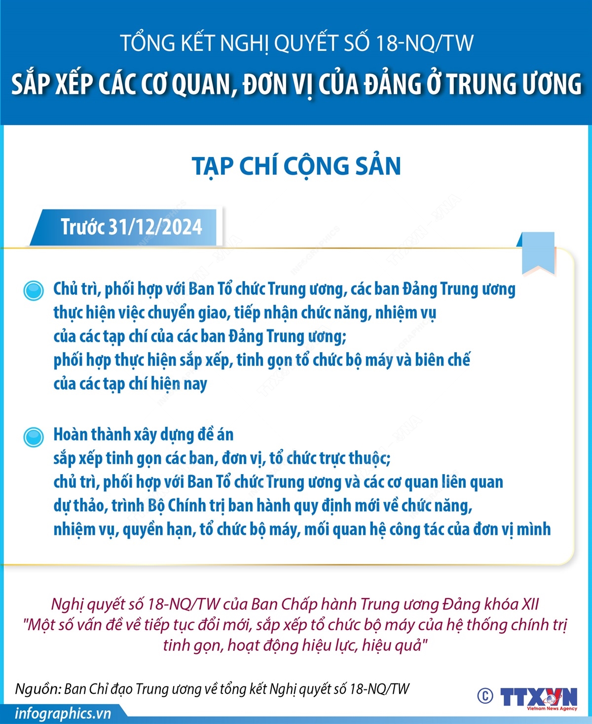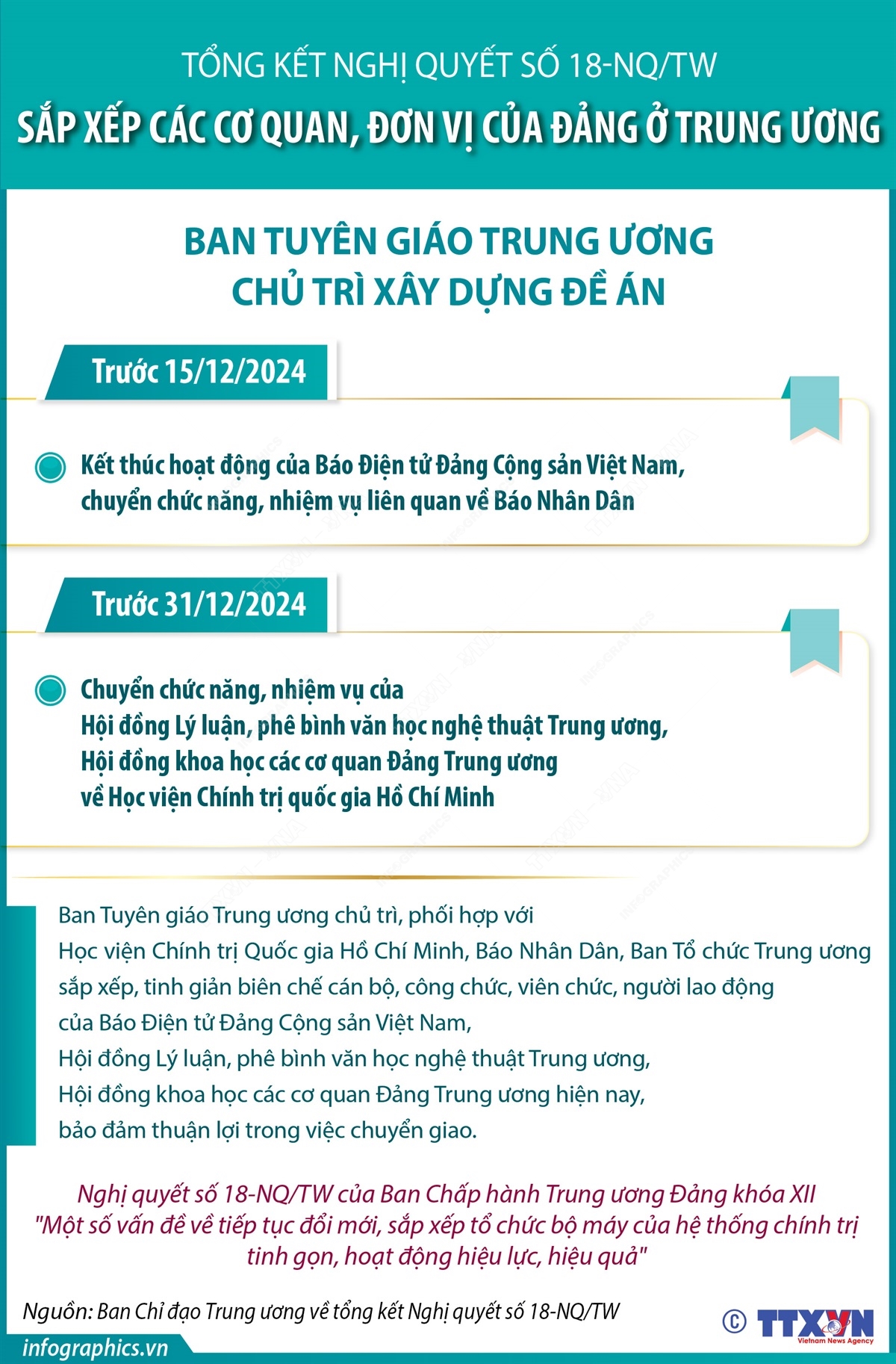 Tại Công văn số 21-CV/BCĐ ngày 5/12/2024, Ban Chỉ đạo Trung ương về tổng kết Nghị quyết số 18-NQ/TW yêu cầu các ban Đảng Trung ương chủ trì xây dựng đề án: Rà soát, sắp xếp tinh gọn đầu mối cấp vụ, cấp phòng, đơn vị, tổ chức trực thuộc; chủ trì, phối hợp với Ban Tổ chức Trung ương và các cơ quan liên quan dự thảo, trình Bộ Chính trị ban hành quy định mới về chức năng, nhiệm vụ, quyền hạn, tổ chức bộ máy, mối quan hệ công tác của cơ quan, đơn vị mình (hoàn thành trước ngày 31/12/2024); Rà soát các ban chỉ đạo do cơ quan, đơn vị là cơ quan thường trực, đề xuất Bộ Chính trị, Ban Bí thư kết thúc hoạt động (chỉ giữ lại những ban chỉ đạo có chức năng, nhiệm vụ thực sự cần thiết) (hoàn thành trước ngày 31/12/2024)…