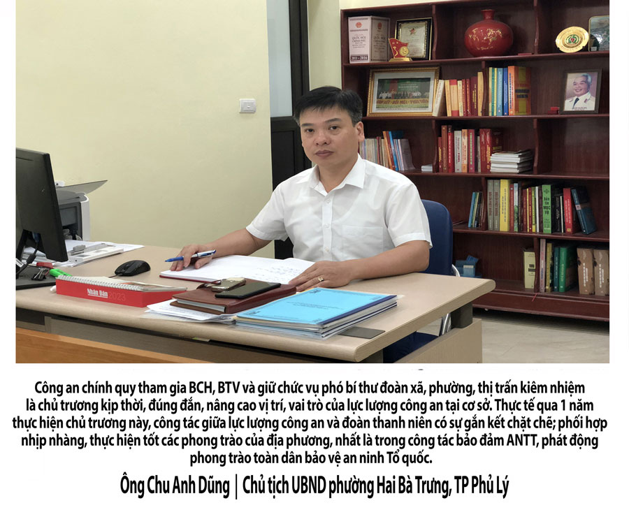 Hà Nam là tỉnh đi đầu thực hiện chủ trương bố trí công an chính quy tham gia BCH, BTV và giữ chức phó bí thư đoàn kiêm nhiệm tại 109/109 xã, phường, thị trấn trên địa bàn. Qua 1 năm triển khai, các đồng chí công an chính quy giữ chức phó bí thư đoàn cơ sở kiêm nhiệm đã phối hợp triển khai thực hiện có hiệu quả công tác đoàn và phong trào TTN gắn với thực hiện nhiệm vụ bảo đảm ANTT. Đây là một chủ trương kịp thời, đúng đắn, nâng cao vị trí, vai trò của lực lượng công an cơ sở. Hiệu quả của việc kiêm nhiệm đồng thời hai chức danh giúp cho công tác lãnh đạo, chỉ đạo, triển khai thực hiện công việc ở cơ sở bảo đảm trực tiếp và toàn diện, qua đó, củng cố lòng tin của nhân dân với Đảng; nâng cao uy tín của tổ chức đoàn và công an cấp xã với cấp ủy, chính quyền và nhân dân mỗi địa phương.