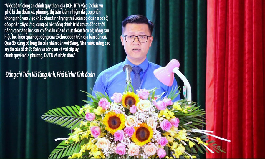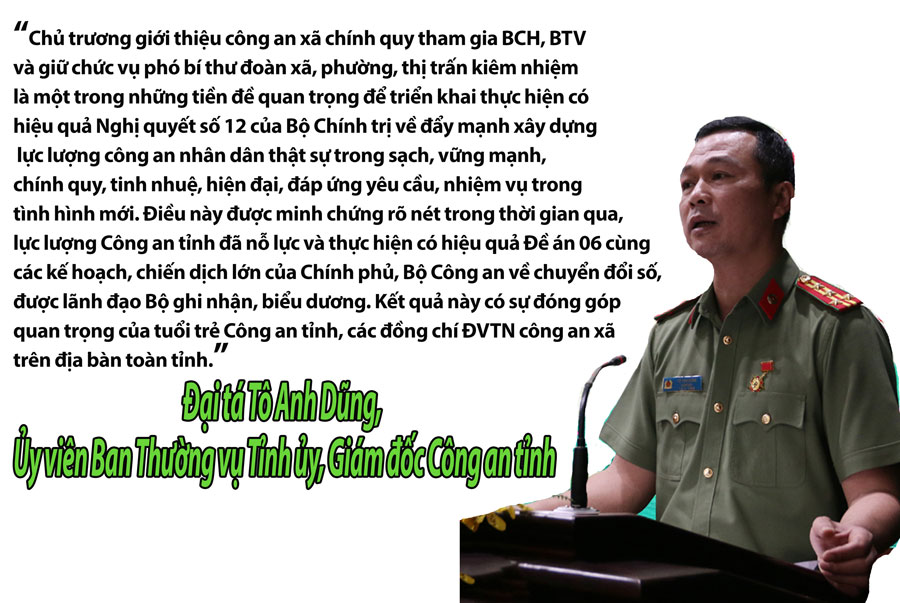Góp phần xây dựng, củng cố hệ thống chính trị ở cơ sở, đồng thời nâng cao năng lực lãnh đạo, hiệu quả quản lý, điều hành của tổ chức đoàn, năm 2022, Công an tỉnh phối hợp với Ban Thường vụ (BTV) Tỉnh đoàn báo cáo Thường trực Tỉnh ủy về chủ trương bố trí công an chính quy tham gia ban chấp hành (BCH), BTV và giữ chức vụ phó bí thư đoàn xã, phường, thị trấn kiêm nhiệm. Qua 1 năm triển khai thực hiện, bước đầu đạt được nhiều kết quả tích cực, góp phần thúc đẩy các hoạt động công tác đoàn tại cơ sở, phục vụ tốt nhiệm vụ bảo đảm an ninh chính trị (ANCT), trật tự an toàn xã hội (TTATXH) tại địa phương.