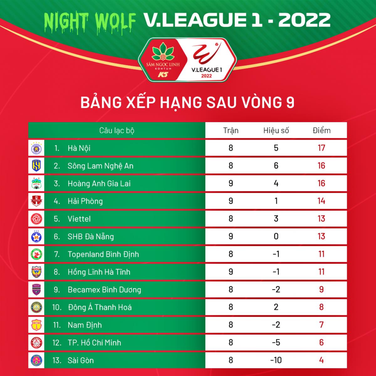 Sau vòng 9 V-League 2022: HAGL đua vô địch với Hà Nội FC và SLNA