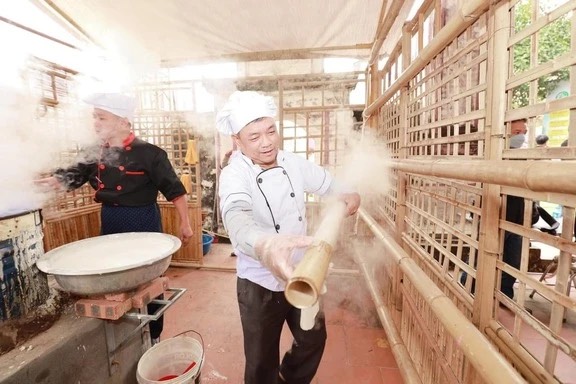 | Từng công đoạn tạo ra sợi phở Vân Cù được tái hiện lại rất chi tiết tại sự kiện Festival Phở 2024. |