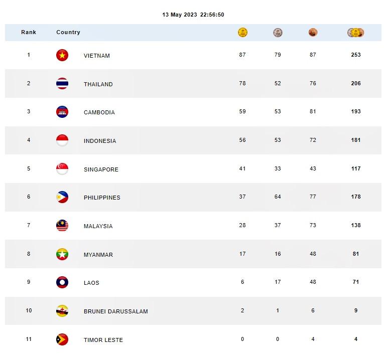 Kết thúc ngày thi đấu 13/5 - ngày thi đấu chính thức thứ 8 của SEA Games 32, Đoàn Thể thao Việt Nam đã nhận "cơn mưa Vàng" với 16 HCV ở các bộ môn thế mạnh.