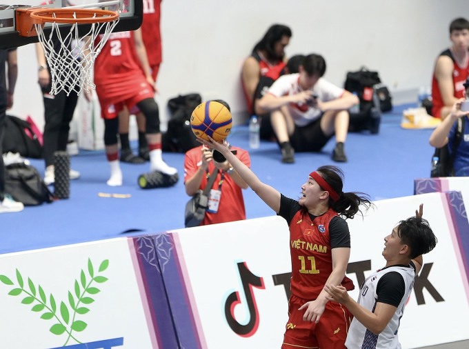 Sau đó ít phút, đội bóng rổ nữ 3x3 Việt Nam thắng trận thứ hai ở vòng bảng, khi hạ Thái Lan 16-14.