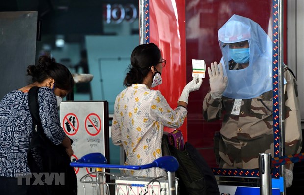 Nhân viên an ninh đeo khẩu trang và mặt nạ bảo hộ phòng lây nhiễm COVID-19 tại sân bay quốc tế Indira Gandhi ở New Delhi, Ấn Độ ngày 25/5. (Ảnh: THX/TTXVN)