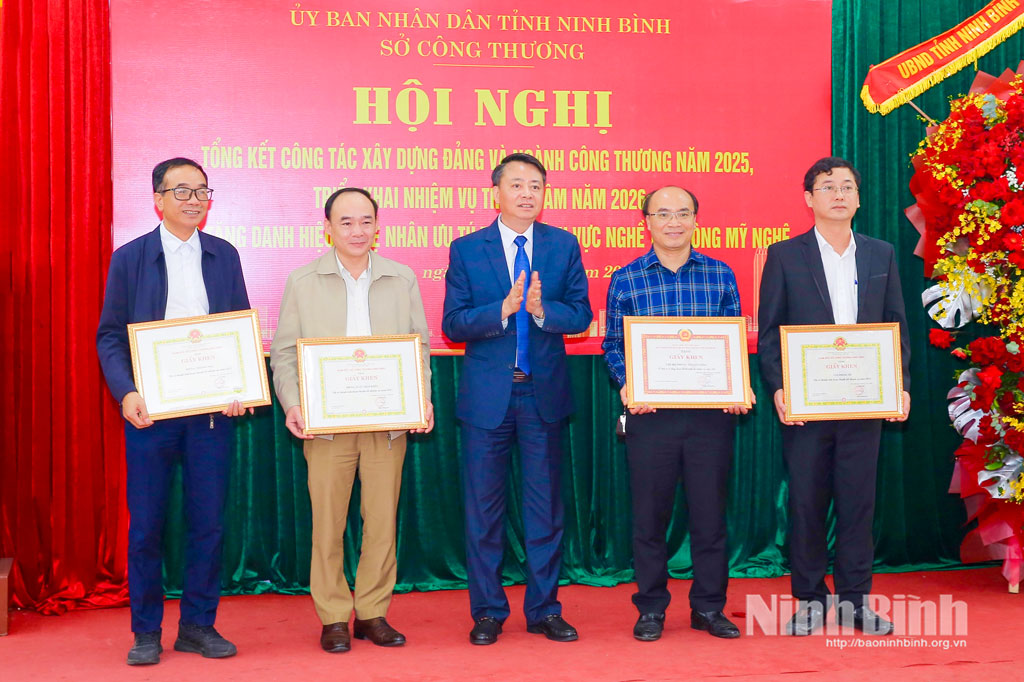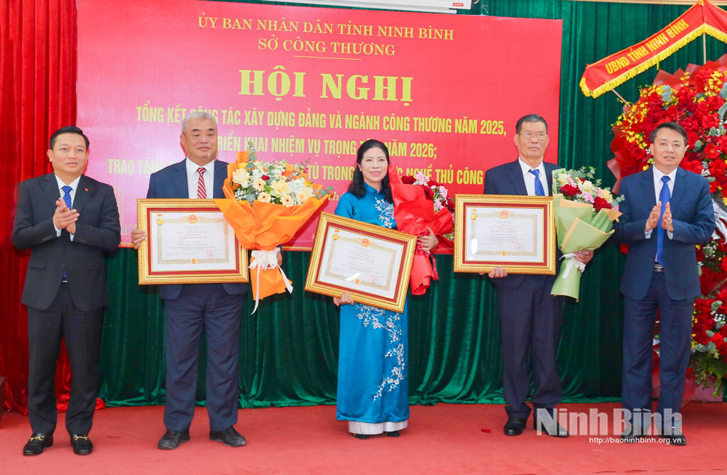Tại hội nghị, thừa ủy quyền của Chủ tịch nước, đồng chí Nguyễn Cao Sơn, Tỉnh ủy viên, Phó Chủ tịch UBND tỉnh trao tặng danh hiệu Nghệ nhân ưu tú cho 3 nghệ nhân xuất sắc trong các nghề thêu ren, đúc đồng và đan cói, bèo. Đại diện lãnh đạo Sở Công Thương trao tặng Giấy khen của Đảng ủy và Sở Công Thương cho 4 tập thể và 35 cá nhân có thành tích xuất sắc trong công tác Đảng và thực hiện nhiệm vụ chuyên môn.