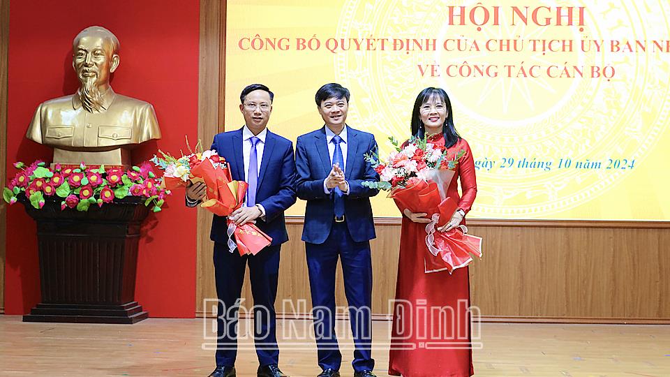 Tại hội nghị, lãnh đạo Sở Nội vụ đã công bố Quyết định số 2318/QĐ-UBND và Quyết định số 2326/QĐ-UBND ngày 28/10/2024 của Chủ tịch UBND tỉnh về việc bổ nhiệm đồng chí Nguyễn Thị Minh Nguyệt, Trưởng Phòng Tổ chức cán bộ và đồng chí Bùi Văn Khiết, Trưởng Phòng Giáo dục Trung học, Sở GD và ĐT giữ chức vụ Phó Giám đốc Sở GD và ĐT. Thời hạn giữ chức vụ 5 năm kể từ ngày bổ nhiệm.