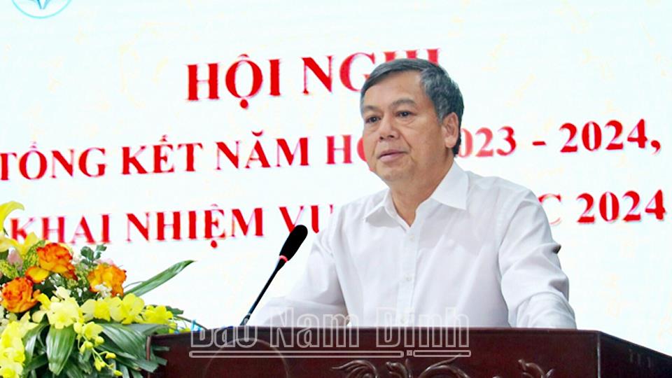 Phát biểu chỉ đạo hội nghị, đồng chí Phó Chủ tịch UBND tỉnh Trần Lê Đoài biểu dương các kết quả đạt được của ngành GD và ĐT tỉnh trong năm học 2023-2024. Đồng chí nhấn mạnh: Trong năm học 2024-2025, ngành GD và ĐT phối hợp các sở, ban, ngành, UBND các huyện, thành phố tập trung tổ chức tốt Lễ khai giảng năm học mới đảm bảo an toàn, tạo khí thế vui tươi, phấn khởi cho giáo viên và học sinh. Quan tâm công tác chuẩn bị sách giáo khoa cho học sinh trước năm học mới, đảm bảo tất cả học sinh đều có sách giáo khoa. Tập trung triển khai Kết luận số 91-KL/TW ngày 12/8/2024 của Bộ Chính trị về tiếp tục thực hiện đổi mới căn bản toàn diện GD và ĐT. Sau khi Chính phủ ban hành chương trình, kế hoạch thực hiện Kết luận số 91-KL/TW, ngành Giáo dục tỉnh tham mưu Tỉnh ủy, UBND tỉnh ban hành chương trình, kế hoạch hành động của tỉnh phù hợp với điều kiện của địa phương. Phát triển đội ngũ giáo viên, giảng viên và cán bộ quản lý cơ sở giáo dục bảo đảm đủ số lượng và nâng cao về chất lượng, đáp ứng yêu cầu đổi mới GD và ĐT. Chủ động thông tin, truyền thông về các chủ trương, chính sách mới của ngành; việc triển khai thực hiện các nghị quyết của Đảng, Quốc hội, Chính phủ về đổi mới căn bản, toàn diện GD và ĐT; các hoạt động và các sự kiện lớn của ngành như: kỷ niệm 80 năm xây dựng và phát triển của ngành Giáo dục, Kỳ thi tốt nghiệp THPT năm 2025, tổng kết đánh giá việc triển khai thực hiện đổi mới chương trình, sách giáo khoa GDPT; tăng cường phối hợp, xử lý hiệu quả các vấn đề về truyền thông, nhất là các vấn đề xã hội quan tâm, bức xúc để xã hội, nhân dân hiểu, chia sẻ, ủng hộ, đóng góp nhiều hơn cho ngành. UBND các huyện, thành phố tiếp tục quan tâm chỉ đạo ngành Giáo dục địa phương; quan tâm công tác quy hoạch đất cho các cơ sở giáo dục, kinh phí đầu tư cơ sở vật chất, thiết bị dạy học, rà soát, tuyển dụng, bố trí đội ngũ giáo viên; quan tâm các nguyện vọng, đề xuất của Phòng GD và ĐT và các cơ sở giáo dục trên địa bàn.