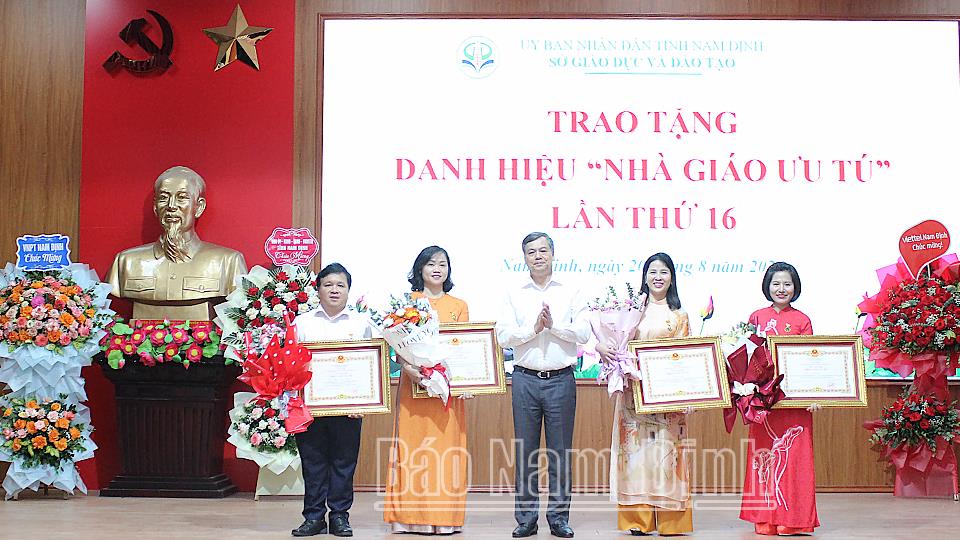 Tại hội nghị, thừa ủy quyền của Chủ tịch nước, đồng chí Phó Chủ tịch UBND tỉnh Trần Lê Đoài đã trao tặng danh hiệu vinh dự Nhà giáo Ưu tú cho 4 nhà giáo: Trần Thị Thanh Xuân, Tổ trưởng tổ Sinh học Trường THPT chuyên Lê Hồng Phong; Nguyễn Hoàng Cương, Tổ trưởng tổ Toán Trường THPT chuyên Lê Hồng Phong; Vũ Thị Quỳnh Anh, Tổ trưởng tổ Ngữ văn Trường THPT Trần Hưng Đạo (thành phố Nam Định); Mai Thị Lừng, Hiệu trưởng Trường THPT Trần Văn Lan (Mỹ Lộc)./.
