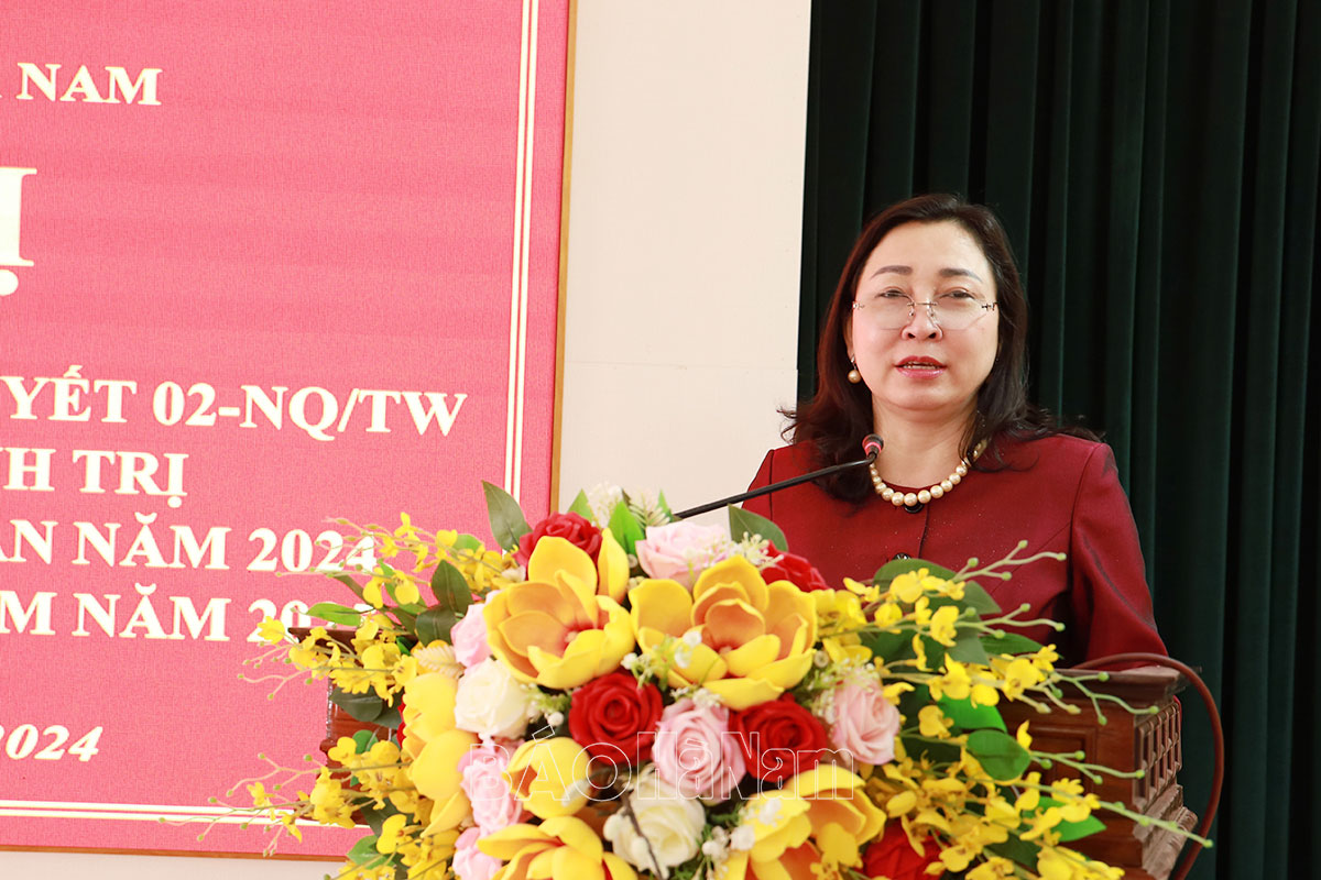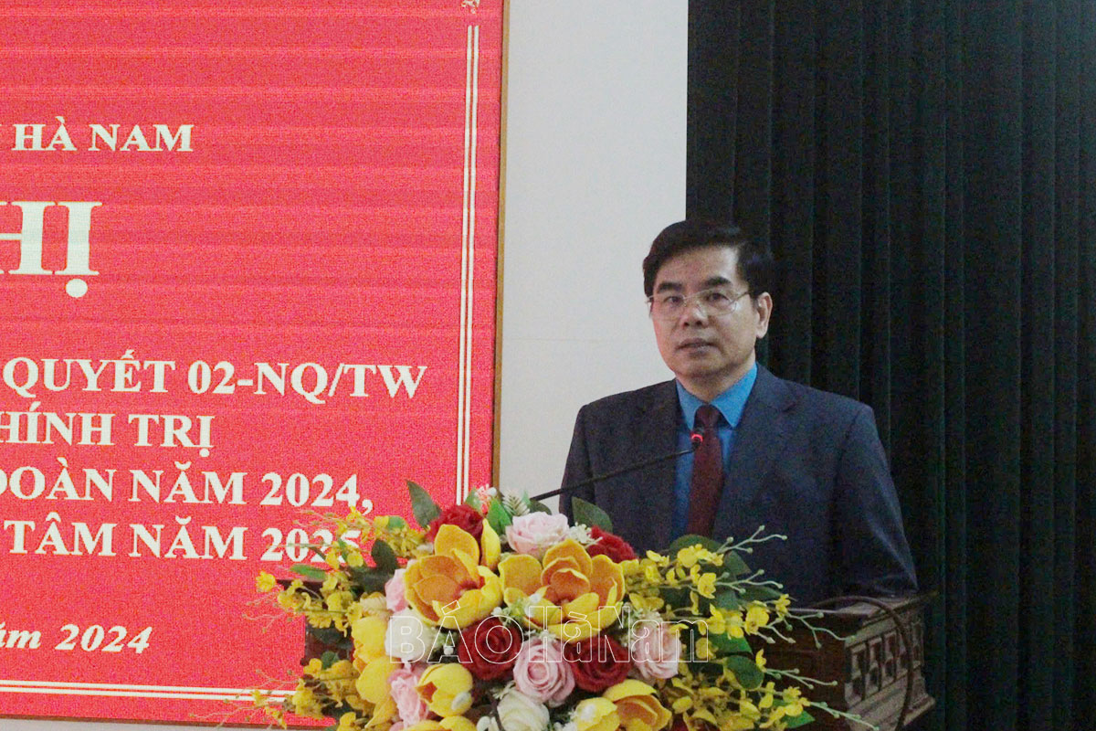 Phát biểu chỉ đạo tại hội nghị, đồng chí Phó Bí thư Thường trực Tỉnh ủy Đinh Thị Lụa và Phó Chủ tịch Tổng LĐLĐ Việt Nam Phan Văn Anh ghi nhận, biểu dương và đánh giá cao những kết quả toàn diện mà các cấp công đoàn tỉnh đạt được trong việc thực hiện Nghị quyết 02, góp phần vào sự phát triển kinh tế - xã hội của tỉnh. Để góp phần thực hiện thắng lợi các nhiệm vụ chính trị của Tổng LĐLĐ Việt Nam và của Ban Thường vụ Tỉnh ủy năm 2025, cũng như các chỉ tiêu, nhiệm vụ Nghị quyết Đại hội Đảng bộ tỉnh lần thứ XX đề ra, đồng chí Phó Bí thư Thường trực Tỉnh ủy và Phó Chủ tịch Tổng LĐLĐ Việt Nam đề nghị các cấp công đoàn tỉnh tiếp tục thực hiện có hiệu quả Nghị quyết 02, Chương trình hành động số 35-Ctr/TU ngày 11/10/2021 của Ban Thường vụ Tỉnh ủy về thực hiện Nghị quyết 02.