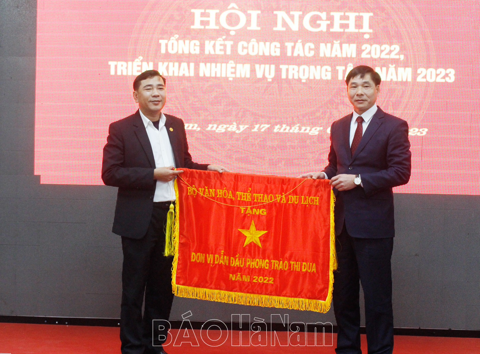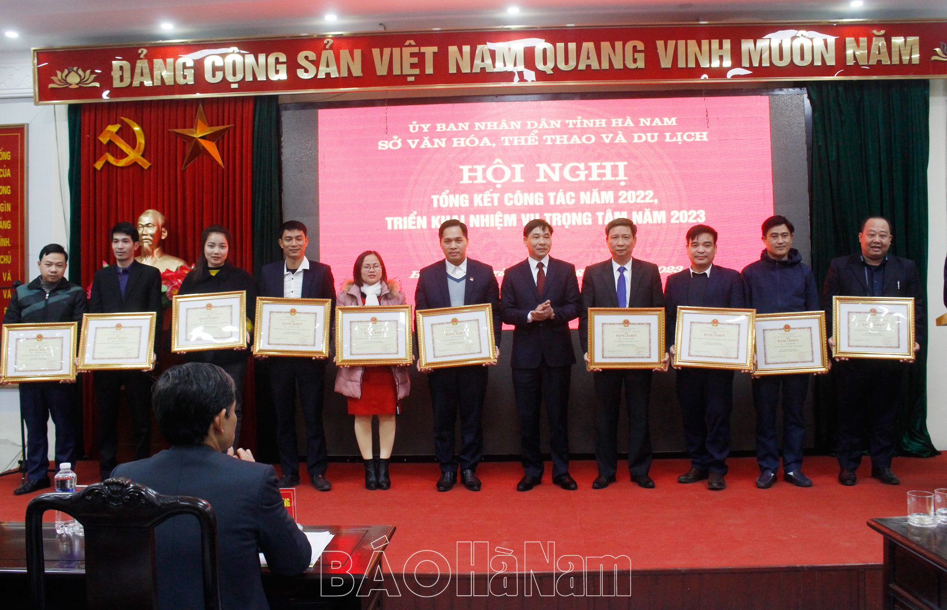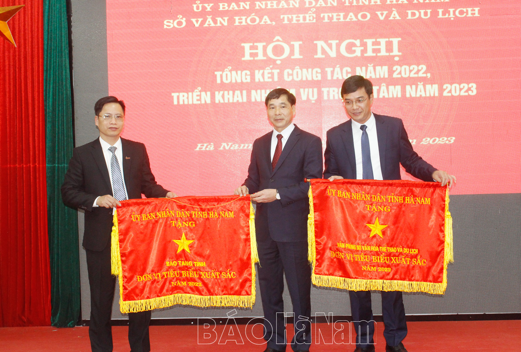 Tại hội nghị tổng kết, thừa ủy quyền của lãnh đạo Bộ VH,TT&DL đồng chí Nguyễn Anh Chức, Phó Chủ tịch Thường trực UBND tỉnh đã trao Cờ thi đua cho Sở VH,TT&DL vì đã hoàn thành xuất sắc nhiệm vụ công tác, được bầu chọn, suy tôn trong khối thi đua của Bộ VH,TT&DL năm 2022; trao Cờ thi đua xuất sắc cho Phòng VHTT huyện Bình Lục đã có thành tích tiêu biểu, xuất sắc trong xây dựng và tổ chức hoạt động VH,TT&DL tại địa phương năm 2022. Đồng chí cũng đã trao nhiều Bằng khen của Bộ VH,TT&DL, của UBND tỉnh cho các tập thể, cá nhân của Sở có thành tích xuất sắc trong các hội thi, liên hoan văn hóa văn nghệ và thi đấu TDTT toàn quốc, khen thưởng thành tích trong công tác tổ chức Liên hoan Chèo toàn quốc và Hội diễn Hội tụ sông Hồng mở rộng năm 2022 và đăng cai tổ chức nội dung môn Futsal nam, nữ Sea Games 31…