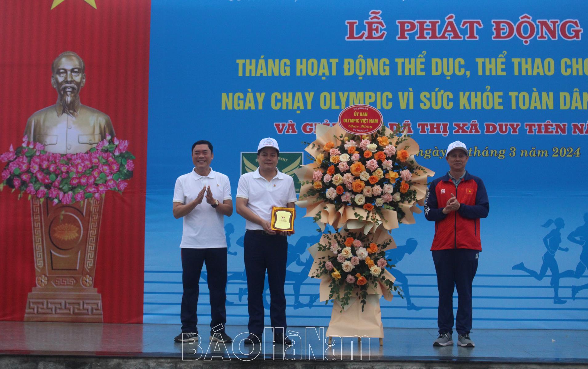 Đại diện lãnh đạo Ủy ban Olympic Việt Nam tặng hoa và chứng thư cho BTC.Lãnh đạo UBND thi xã Duy Tiên tặng hoa Ban tổ chức chương trình.