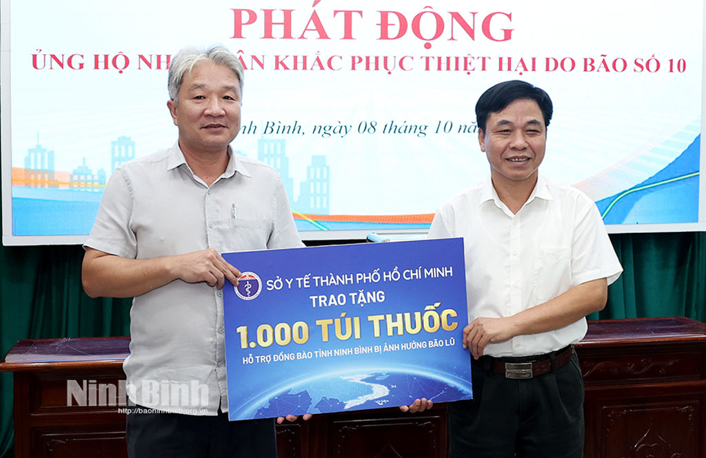 Lãnh đạo Sở Y tế Ninh Bình tiếp nhận 1000 túi thuốc từ Sở Y tế Thành phố Hồ Chí Minh trao tặng người dân ở những vùng bị ảnh hưởng bởi mưa bão.
