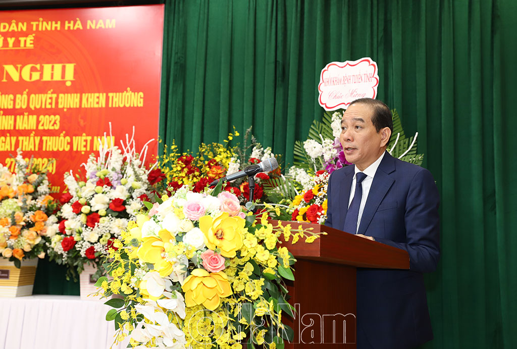 Phát biểu tại hội nghị, thay mặt Tỉnh ủy, HĐND, UBND tỉnh, đồng chí Phó Chủ tịch UBND tỉnh Trần Xuân Dưỡng ghi nhận những nỗ lực, cống hiến của đội ngũ cán bộ y tế trong những năm qua, đặc biệt là từ khi đại dịch COVID-19 xuất hiện, ngành Y tế cùng đội ngũ cán bộ y tế đã trải qua nhiều khó khăn, vất vả. Năm 2023, khi đại dịch COVID được khống chế, các hoạt động kinh tế, văn hóa xã hội trở lại hoạt động bình thường, toàn ngành đã đoàn kết, khắc phục hậu quả đại dịch, tiếp tục tập trung củng cố, kiện toàn tổ chức, nâng cao chất lượng công tác điều trị, chăm sóc sức khỏe nhân dân với những kết quả đáng khích lệ.