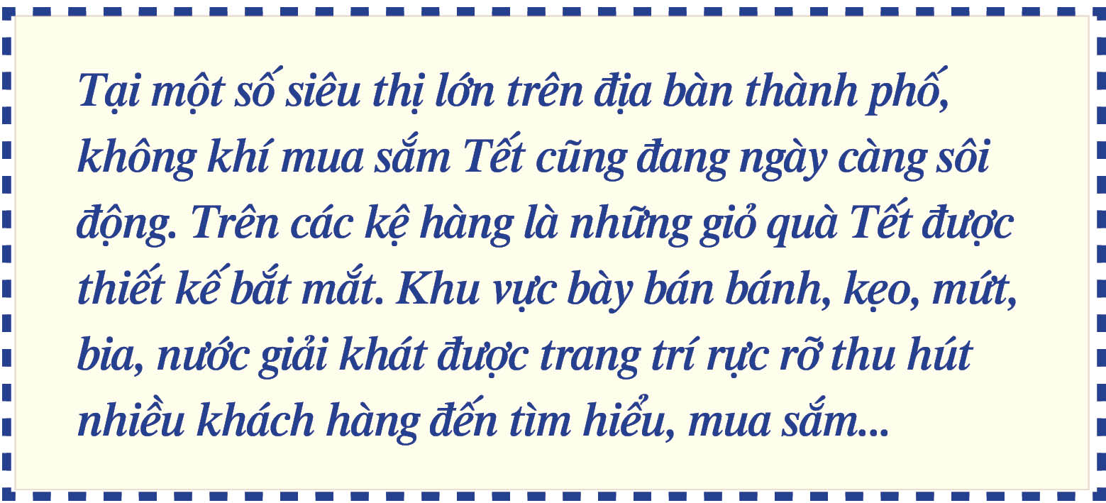Tại một số siêu thị lớn trên địa bàn thành phố, không khí mua sắm Tết cũng đang ngày càng sôi động. Trên các kệ hàng là những giỏ quà Tết được thiết kế bắt mắt. Khu vực bày bán bánh, kẹo, mứt, bia, nước giải khát được trang trí rực rỡ thu hút nhiều khách hàng đến tìm hiểu, mua sắm... Ở các siêu thị như: Go, Vinmart, lượng hàng được siêu thị chuẩn bị tăng, nguồn hàng được bổ sung liên tục trên kệ, tập trung ở nhóm hàng tươi sống, bánh kẹo, thực phẩm và đồ dùng thiết yếu.