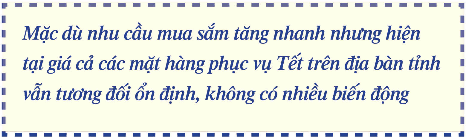 Mặc dù nhu cầu mua sắm tăng nhanh nhưng hiện tại giá cả các mặt hàng phục vụ Tết trên địa bàn tỉnh vẫn tương đối ổn định, không có nhiều biến động, chứng tỏ sự điều tiết thị trường kịp thời của các cấp, các ngành liên quan. Một mùa xuân mới nữa đang đến rất gần, nền kinh tế đang dần phục hồi mang lại những tín hiệu khả quan. Vì vậy, cùng với sự ổn định của thị trường tiêu dùng, người dân trong tỉnh cùng kỳ vọng vào một năm mới khởi sắc với nhiều bứt phá và thành tựu mới./.