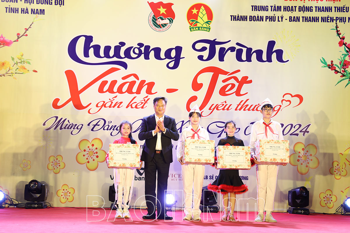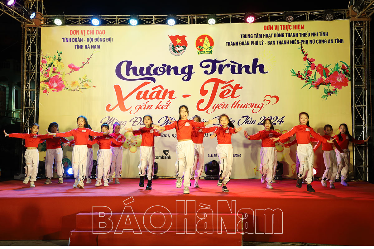Tối ngày 20/1, tại phố đi bộ thành phố Phủ Lý, Trung tâm Hoạt động thanh thiếu nhi tỉnh phối hợp với Thành đoàn Phủ Lý, Ban Thanh niên - Phụ nữ Công an tỉnh tổ chức chương trình Xuân gắn kết - Tết yêu thương, mừng Đảng, mừng Xuân Giáp Thìn năm 2024.