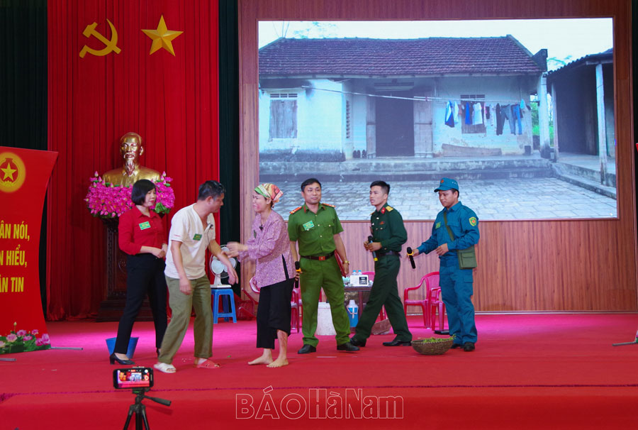 Mang đến hội thi một chương trình nội dung được chuẩn bị kỹ lưỡng, hấp dẫn, đội thi của Ban CHQS thị xã Duy Tiên đã truyền tải thành công thông điệp “Nghe dân nói, nói dân hiểu, làm dân tin” thông qua các mô hình dân vận khéo mang tính thiết thực cao như: “Cùng em đến trường”, “Hỗ trợ xây tặng nhà Nghĩa tình đồng đội cho quân nhân dự bị hoàn cảnh khó khăn”... Tiểu phẩm kịch tuyên truyền mô hình hoạt động tiêu biểu của Ban CHQS thị xã Duy Tiên hấp dẫn người xem bởi sự khéo lồng ghép việc tuyên truyền gia đình có con em trong độ tuổi nhập ngũ nghiêm chỉnh chấp hành Luật Nghĩa vụ quân sự... Với sự sáng tạo, dí dỏm, duyên dáng của các thành viên trong mỗi nội dung thi, đội tuyển của Ban CHQS thị xã Duy Tiên xứng đáng đạt giải nhất hội thi.