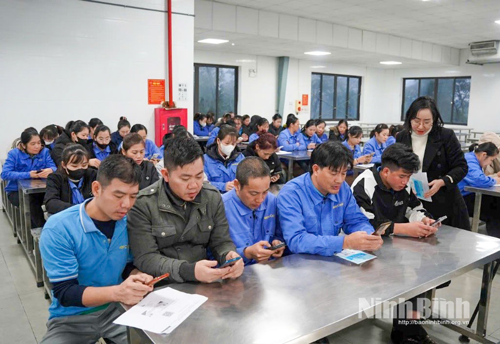 Cán bộ BHXH tỉnh hướng dẫn người lao động Công ty TNHH Hương Phẩm West Coast (Khu công nghiệp Phúc Sơn, phường Nam Hoa Lư) cách thức tham gia cuộc thi.