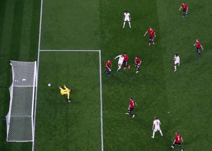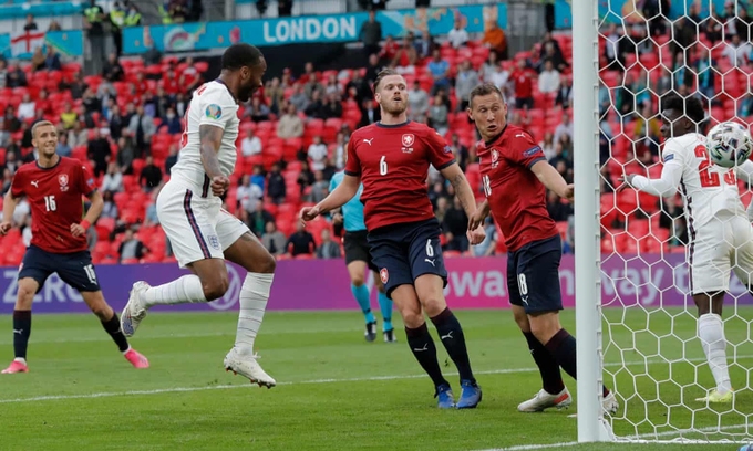 Phút 12, từ quả tạt của Jack Grealish bên cánh trái, Sterling - cầu thủ thấp nhất trên sân - chọn vị trí chính xác và thoải mái đánh đầu trong tư thế không người kèm. Với chiến thắng 1-0 nhờ pha làm bàn này, Anh vượt chính CH Czech chiếm ngôi nhất bảng D sau ba lượt trận.