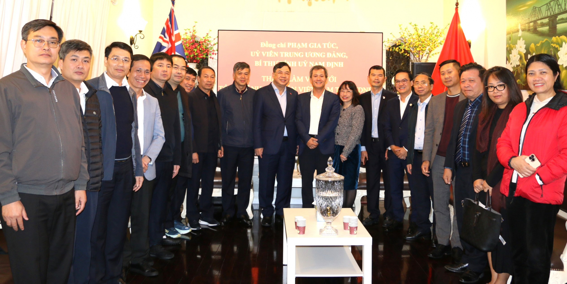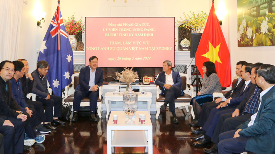 | Đồng chí Bí thư Tỉnh ủy Phạm Gia Túc và đoàn công tác của tỉnh Nam Định đến thăm và làm việc với Tổng Lãnh sự quán Việt Nam tại Sydney. |