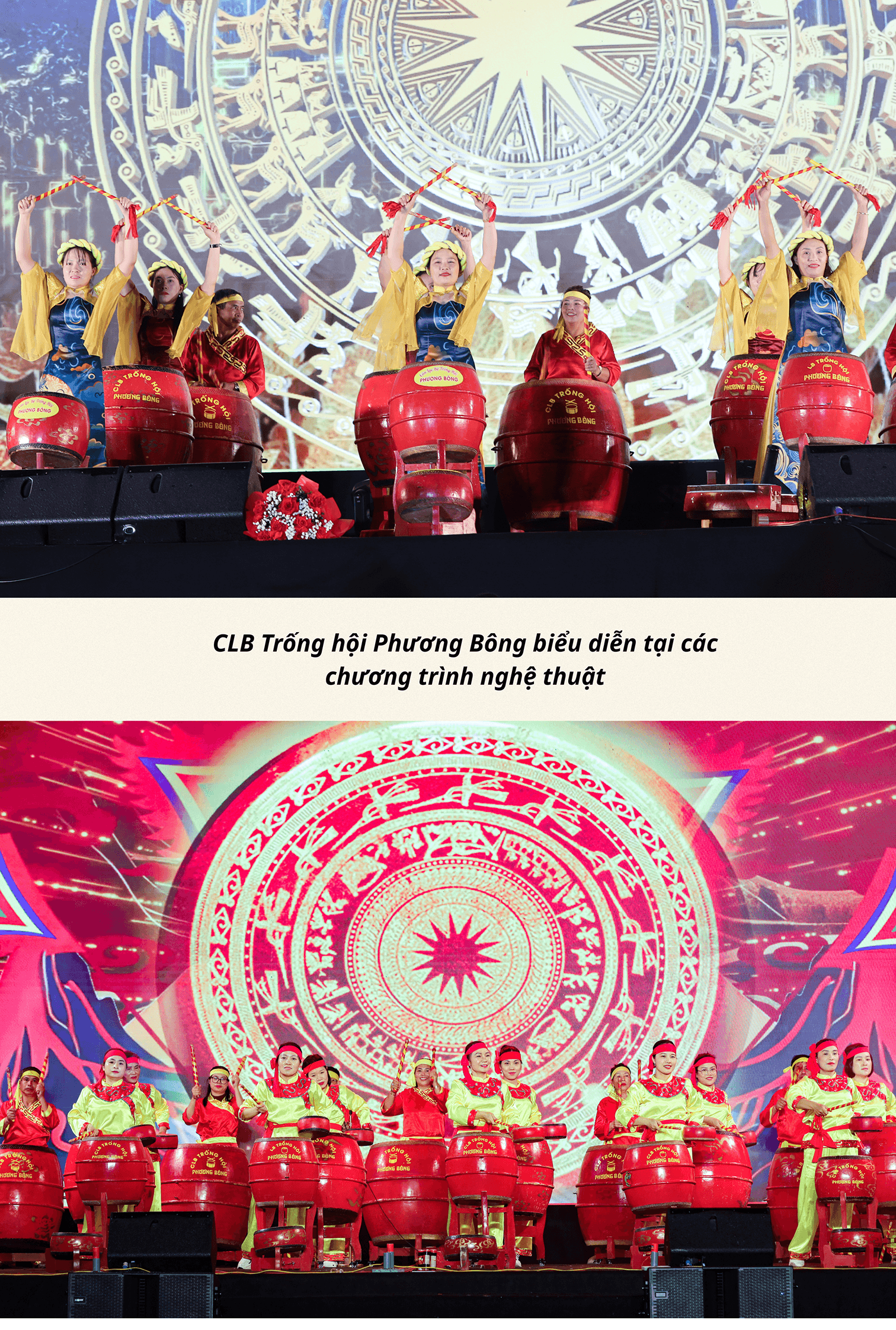 Cùng với “Hồn Việt”, CLB dàn dựng bài “Trống hội khai hoa” với tiết tấu rộn ràng mang ý nghĩa cầu chúc khởi đầu may mắn, mưa thuận gió hòa. Nhờ hoạt động chuyên nghiệp, bài bản, CLB trống hội Phương Bông liên tục nhận thư mời biểu diễn tại các sự kiện quy mô lớn. CLB vinh dự góp mặt tại Lễ Khai ấn Đền Trần và các sự kiện lớn của tỉnh như Concert Trung Thu A18, Chương trình nghệ thuật chào năm mới 2026; chợ Hoa Xuân Thiên Trường, Khai mạc lễ hội Phủ Dầy... Ngoài ra, một số di tích ở các tỉnh lân cận đã mời CLB tham gia biểu diễn tại lễ khai hội. Âm vang trống hội Phương Bông dần vượt qua lũy tre làng, lan tỏa khí phách hào hùng đến đông đảo công chúng trong và ngoài tỉnh.