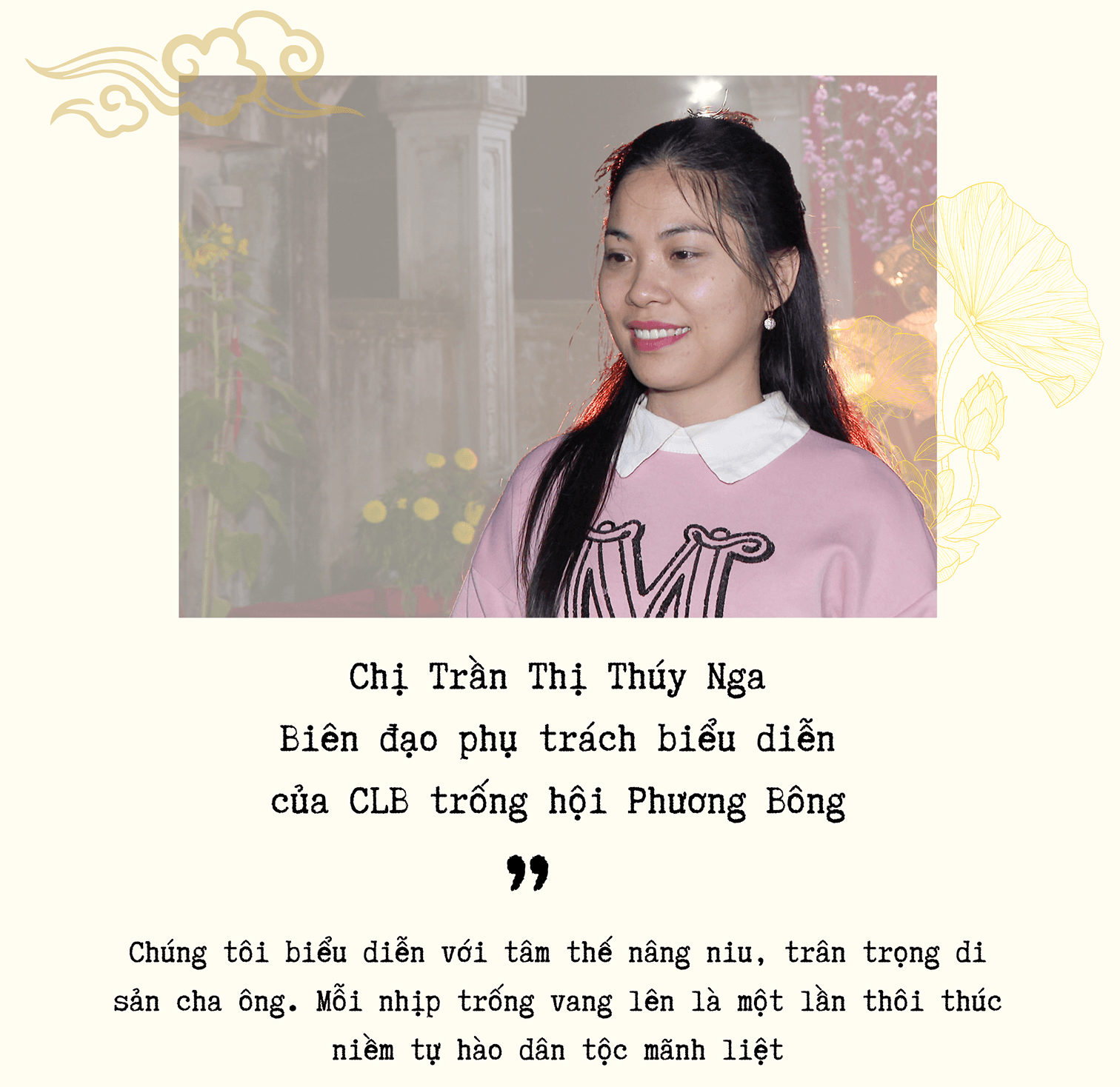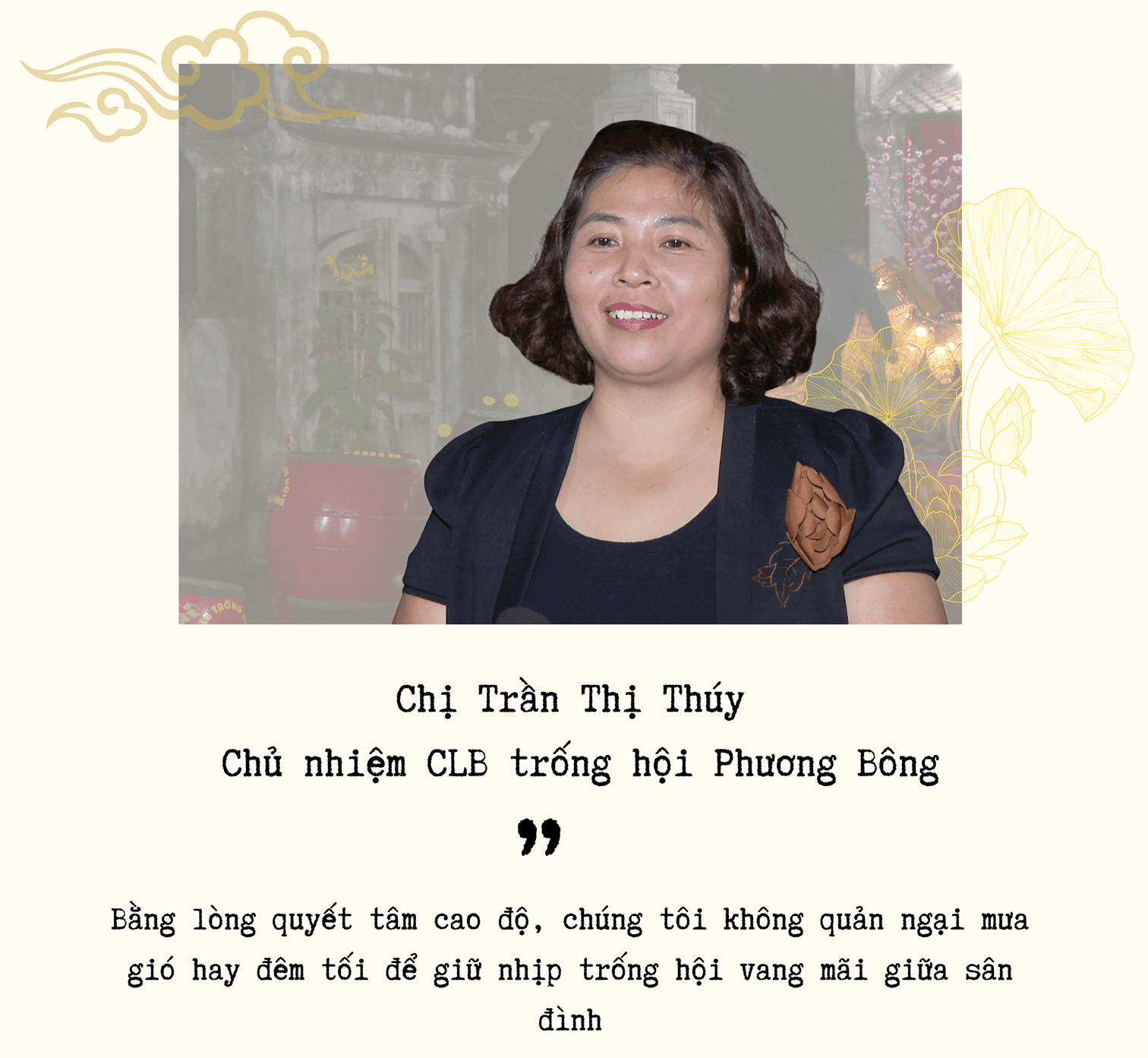 Chị Trần Thị Thúy, Chủ nhiệm CLB chia sẻ hành trình “vượt khó” của tập thể. Các thành viên đảm nhiệm nhiều ngành nghề khác nhau, từ làm nông, công nhân, nhân viên văn phòng đến cán bộ hưu trí. Thời gian đầu, việc sắp xếp thời gian tập luyện chung gặp nhiều trở ngại. Vấn đề kinh phí trang bị trống, đồng phục hoàn toàn dựa vào nguồn xã hội hóa. Với sự quyết tâm cao, các thành viên trong CLB không quản ngại thời tiết mưa gió hay đêm tối để tập nhuần nhuyễn các bài biểu diễn. Sân đình Phương Bông trở thành điểm hẹn văn hóa thân thuộc.